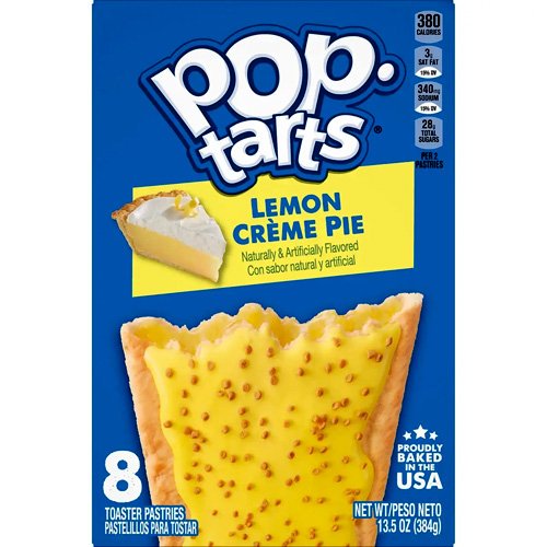 Печенье-бисквит Kellogg's Pop-Tarts Lemon Creme Pie - хрустящий бисквит со вкусом лимонного пирога. Отлично подходит к чаю, кофе или к молочным продуктам. Вкус теста напоминает плотное галетное печенье, слегка сладкое. Сладость дает глазурь, украшенная радужной крошкой и печенье заполнено ароматной начинкой с добрым вкусом. Kellogg's Pop-Tarts — наиболее популярный десерт компании Kellogg. Сладкая двухслойная начинка «Поп-тартс» обёрнута тонким слоем печёного теста. Несмотря на то, что печенье «Поп-тартс» продаётся уже пригодным для употребления в пищу, рекомендуется подогревать его в тостере или микроволновке. В США ежегодно продаются миллионы пачек этого печенья. Распространяется преимущественно в США, а также в Канаде, Великобритании и Ирландии. В упаковке 8 шт.