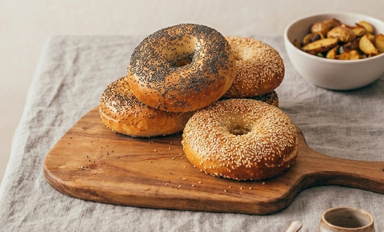 Дрожжи и сахарный песок развести в теплой воде. Добавить муку, соль и масло, замесить тесто. Оставить подходить на 40 мин. Разогреть духовку до 225 °C. Из теста сформовать 12 шариков. Ручной шумовкой сделать в центре шариков отверстия. Опустить пышки на 1 мин в кипящую воду. Вынуть из кастрюли и посыпать маком (или кунжутом). Запекать в духовке в течение 20 мин при 225 °C. Дать пышкам остыть, разрезать пополам и положить на тарелку с нарезанными помидорами.