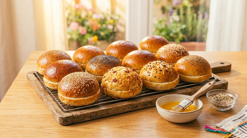 Нагреть плиту до 190 °C. Смазать поверхность булочек растопленным сливочным маслом и добавить украшения. Выпекать булочки от 15 до 20 мин, пока они слегка не покоричневеют.