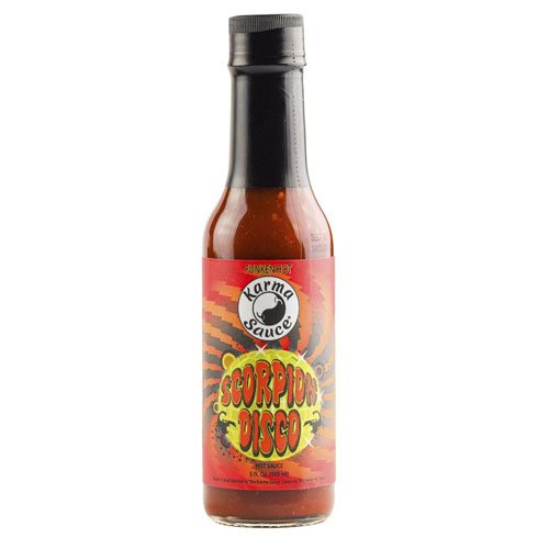 Острый соус Karma Scorpion Disco - острый соус на основе перца 7 Pot, перца Тринидад Скорпион, Призрачного перца, Шоколадного Хабанеро с добавлением сока лайма, чеснока и специй. Острота соуса: около 650,000 сковиллей. Обьем: 148 мл. США.